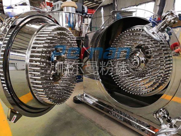 1、棒銷式、敲擊棒式:轉子、定子組成封閉粉碎腔。當物料經加料裝置送入粉碎腔后,在轉子高速旋轉作用下,物料也跟隨加速旋轉,同時在離心力作用下向外周方向運動。在此過程中,物料與轉子及定子上的銷棒之間發生強烈碰撞而被粉碎,并且越往外粉碎程度越劇烈。由于轉子和定子各有3~4層銷棒圈,所以物料的粉碎作用較為充分。棒銷式棒銷較密,適合于超細粉碎;敲擊棒式棒較少,適合于粗粉碎。