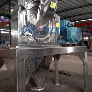 3、磨盤式:物料從進料管進入由靜盤和動磨盤組成的粉碎腔,由于動盤的高速旋轉和風機的作用下,使物料不斷被剪切、撞擊、摩擦,顆粒越來越小,并向外移動,最后經過出料管由集料系統收集。