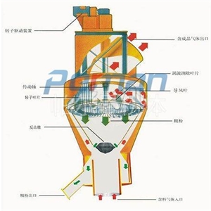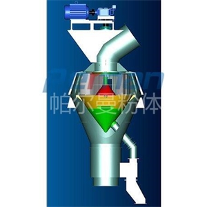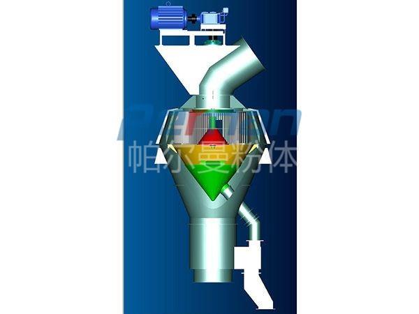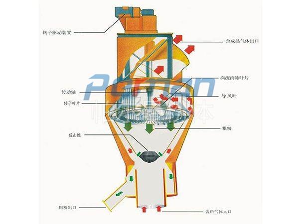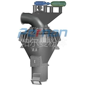 氣流分級機與旋風分離器、除塵器、引風機組成一套分級系統。物料在風機抽力作用下由分級機下端入料口隨上升氣流高速運動至分級區,在高速旋轉的分級渦輪產生的強大離心力作用下